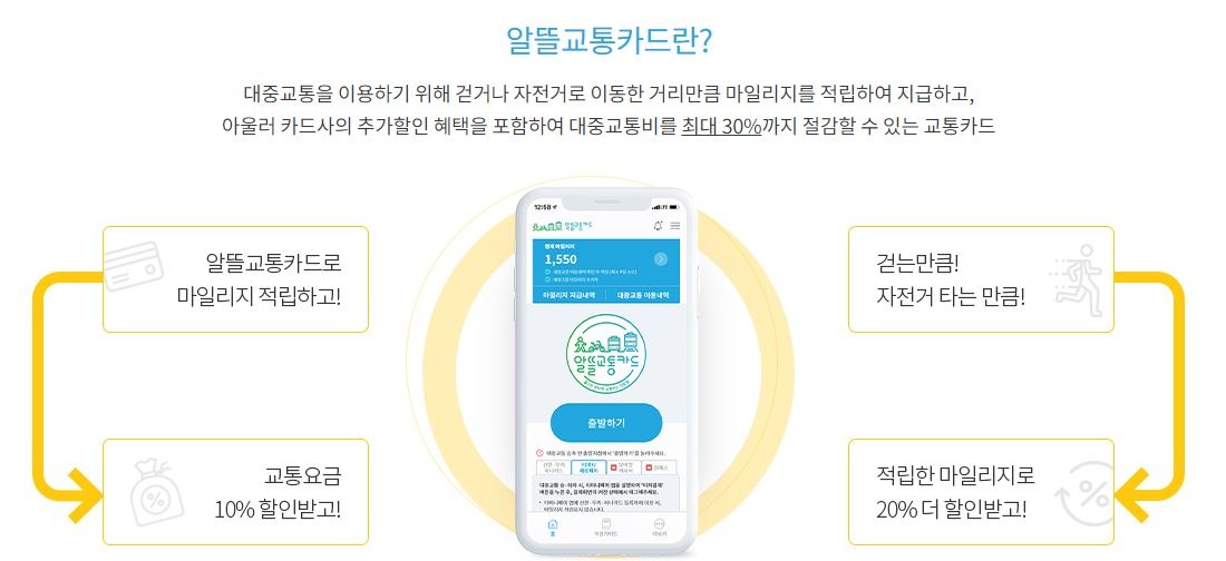 알뜰교통카드는 걷거나 자전거를 타면 마일리지를 적립해 카드사 추가 할인 등 대중교통 비용을 최대 30%까지 절감할 수 있는 교통가드입니다. 할인제도가 풍부한 교통카드로서 대중교통 이용 시 월 15회 이상 결제조건(미세먼지 저감조치 발령 시 2배 제공)이 지급됩니다.