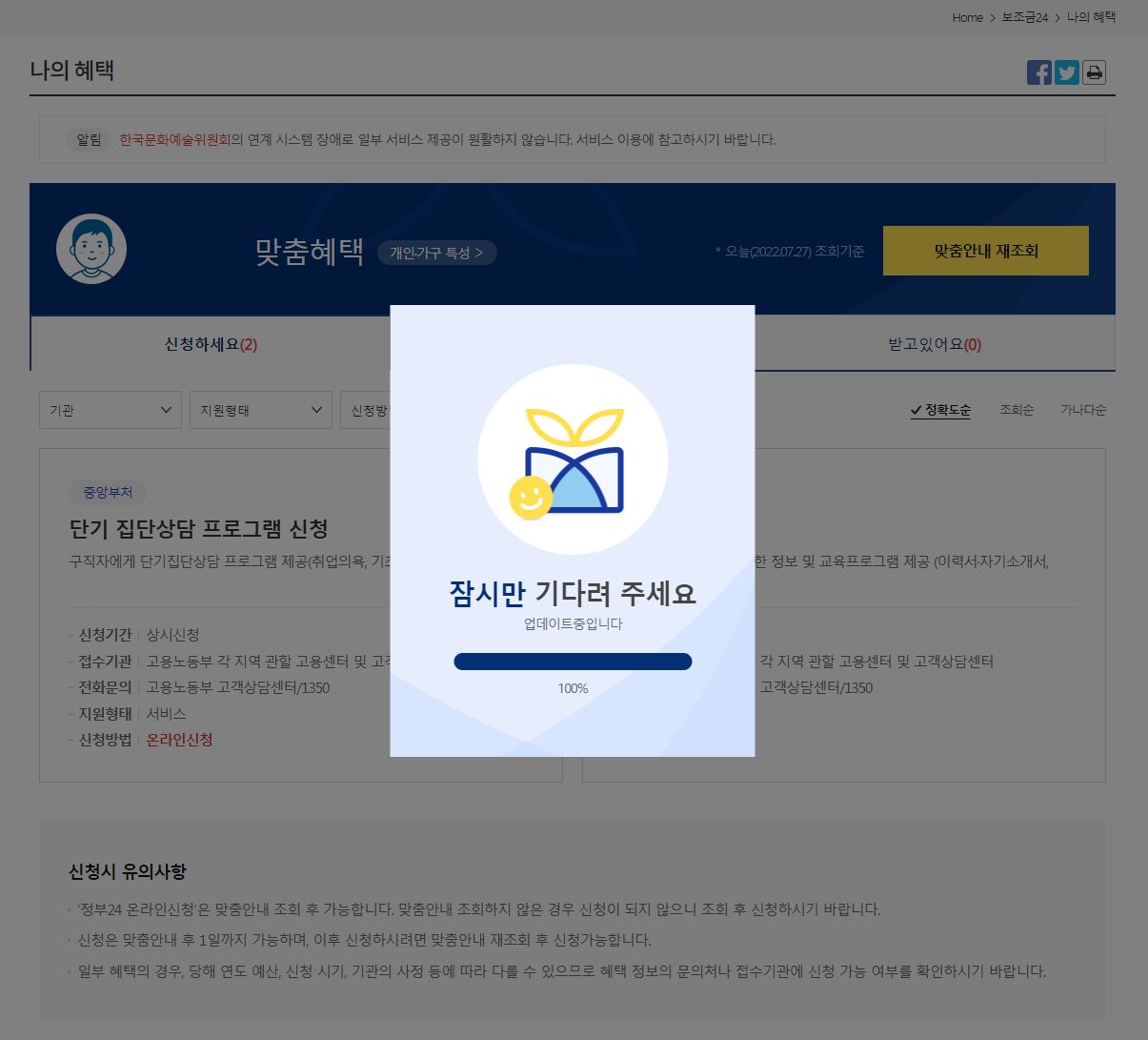 모바일 또는 PC 같은 온라인 사용이 힘드신 분을 께는 "오프라인 신청"도 해드리고 있습니다. 본인의 "신분증을 지참해서, 해당 관할 읍면동 주민센터를 방문하시면 보조금 24 신청서를 제출"하실 수 있습니다. 일단 "맞춤 안내 조회"가 실행되면서 중앙부처 300여 개와 지방자치단체 3000개의 서비스 중 확인해 볼 필요가 있는 것과 신청 대상이 되는 것 중 추천할 만한 것들을 추려 줍니다.
