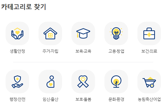 간편하게(지역, 생일, 성별, 소득) 찾기 또는 카테고리로 찾기 가능합니다. 아래에는 카테고리 별 간단히 추려 보았습니다.