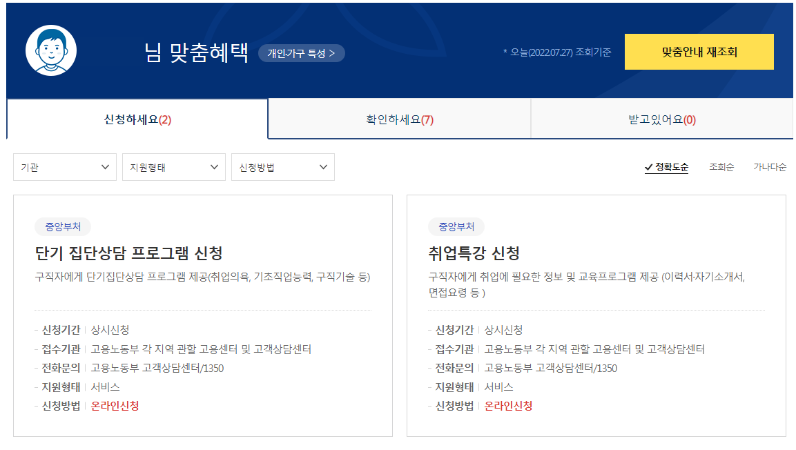예를 들어 가정이 있는 분들의 경우 육아기 근로시간, 단축급여, 육아휴직 급여, 등 육아에 필요한 정책, 청년(취준생)에게 필요한 고용 창업 등 여러 가지 보조금을 알려주며 정말 다양하게 있습니다.