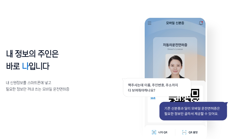 모바일 신분증의 진위 여부는 '모바일 신분증 검증 앱'에서 모바일 운전면허증의 정보 무늬(QR)를 촬영하면 확인할 수 있고, 사용처별로 특화된 신원확인 방식이 제공됩니다.