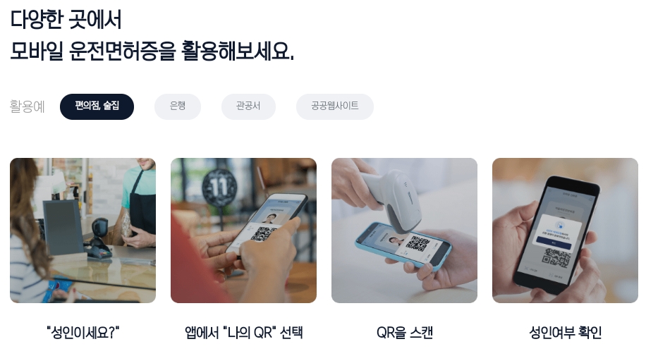 모바일 신분증의 진위 여부는 '모바일 신분증 검증 앱'에서 모바일 운전면허증의 정보 무늬(QR)를 촬영하면 확인할 수 있고, 사용처별로 특화된 신원확인 방식이 제공됩니다.
